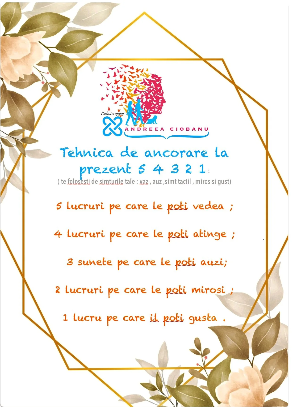utilizarea unor metode de relaxare: Tehnica- ancorarea in prezent: aseaza-te intr-o pozitie confortabila,fara sa incrucisezi mainile sau picioarele, inspira si expira incet si profund.
